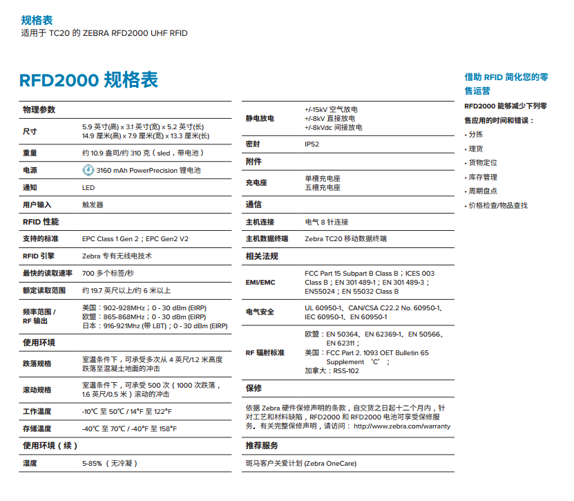 如果您已购入 Zebra TC20 移动数据终端,现在,您只需将 TC20 套入 RFD2000 Sled,即可为其添加强大的 UHF RFID 功能。专为 TC20 设计的 RFD2000 可提供与专用设备完全相同的强大 RFID 性能,您无需牺牲性能,即可获得根据需要添加和去除 RFID 的灵活性。这种绝佳的组合可为您带来全方位的零售解决方案,令库存管理、消费者互动和辅助销售变得轻而易举。